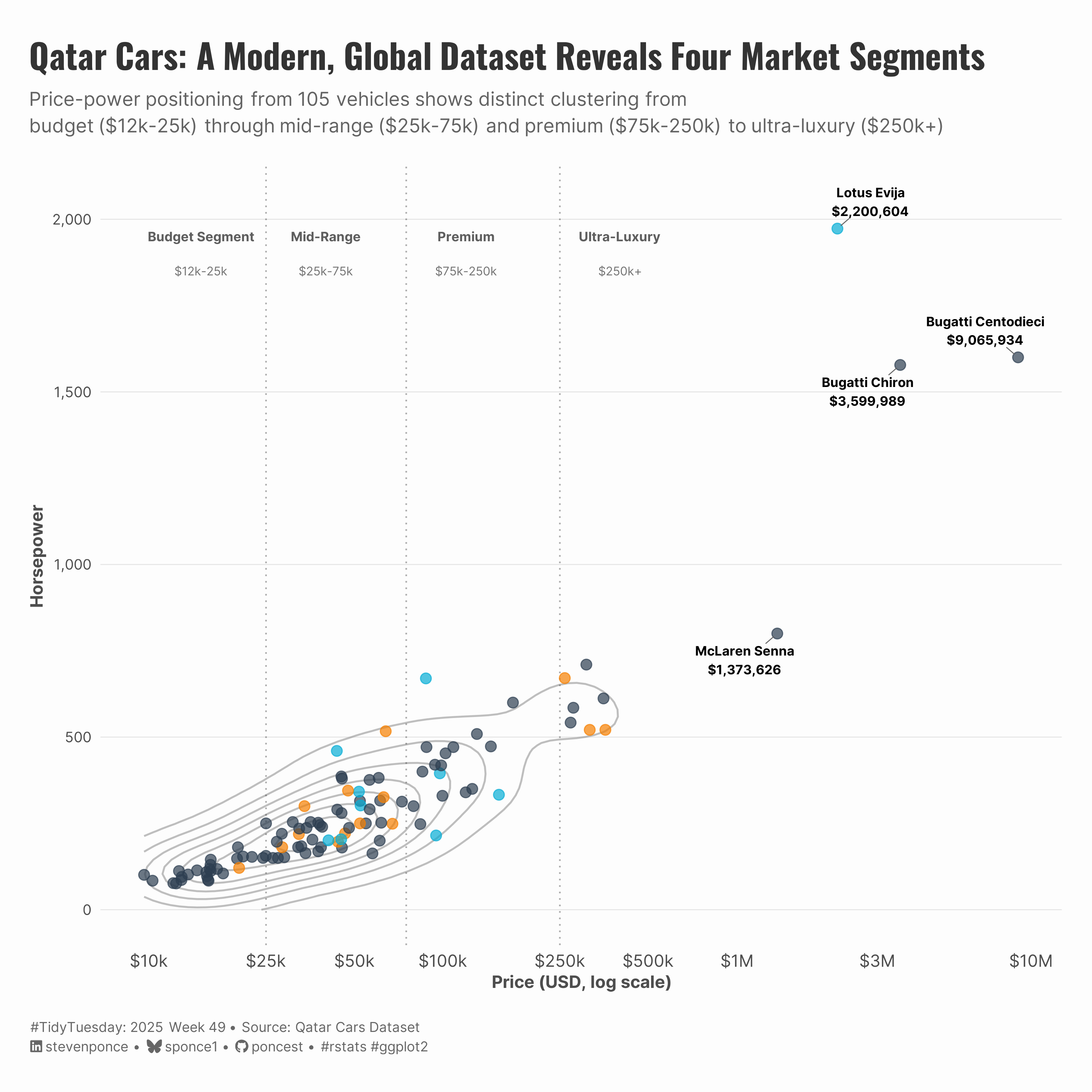 description: "Exploring the Qatar Cars dataset—a modern, internationally-focused alternative to mtcars—through price-power positioning analysis. This scatter plot visualization reveals four distinct market segments and demonstrates how the dataset captures the full automotive spectrum from budget vehicles to multi-million dollar hypercars."
